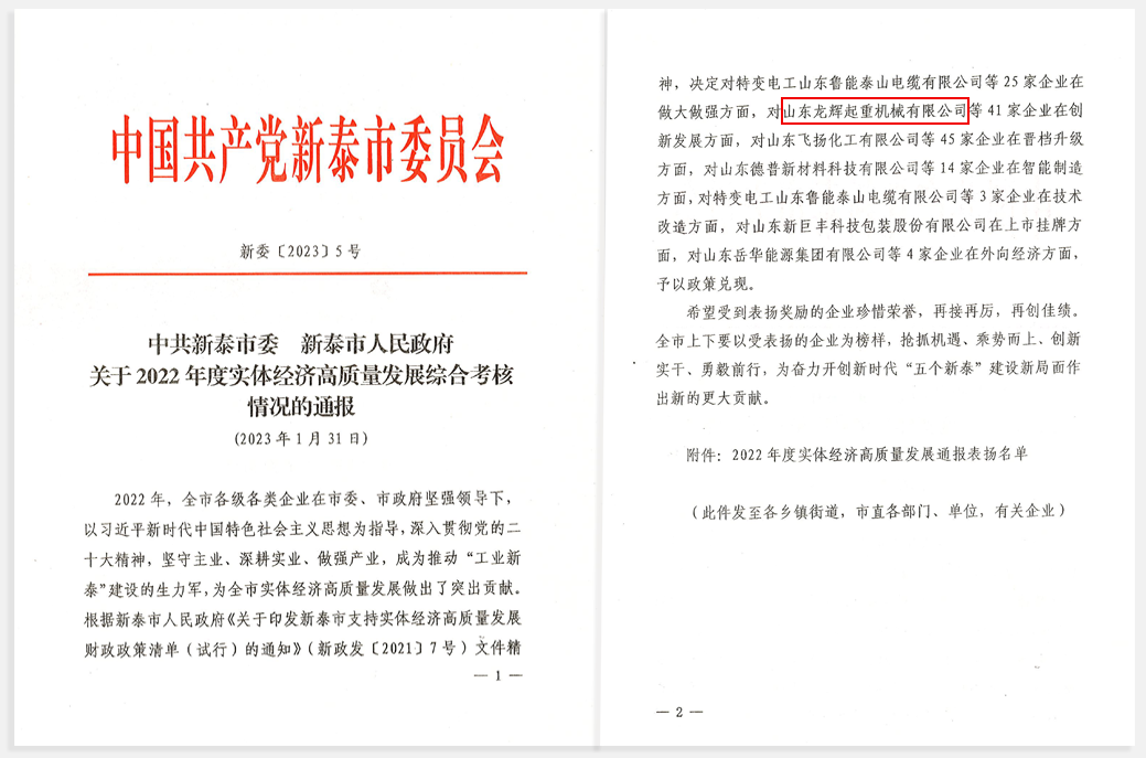 2023年1月30日,新泰市委、市政府召開全市市委經(jīng)濟(jì)工作大會(huì),對(duì)2022年度實(shí)體經(jīng)濟(jì)高質(zhì)量發(fā)展綜合績(jī)效考核表現(xiàn)突出的單位進(jìn)行表彰。