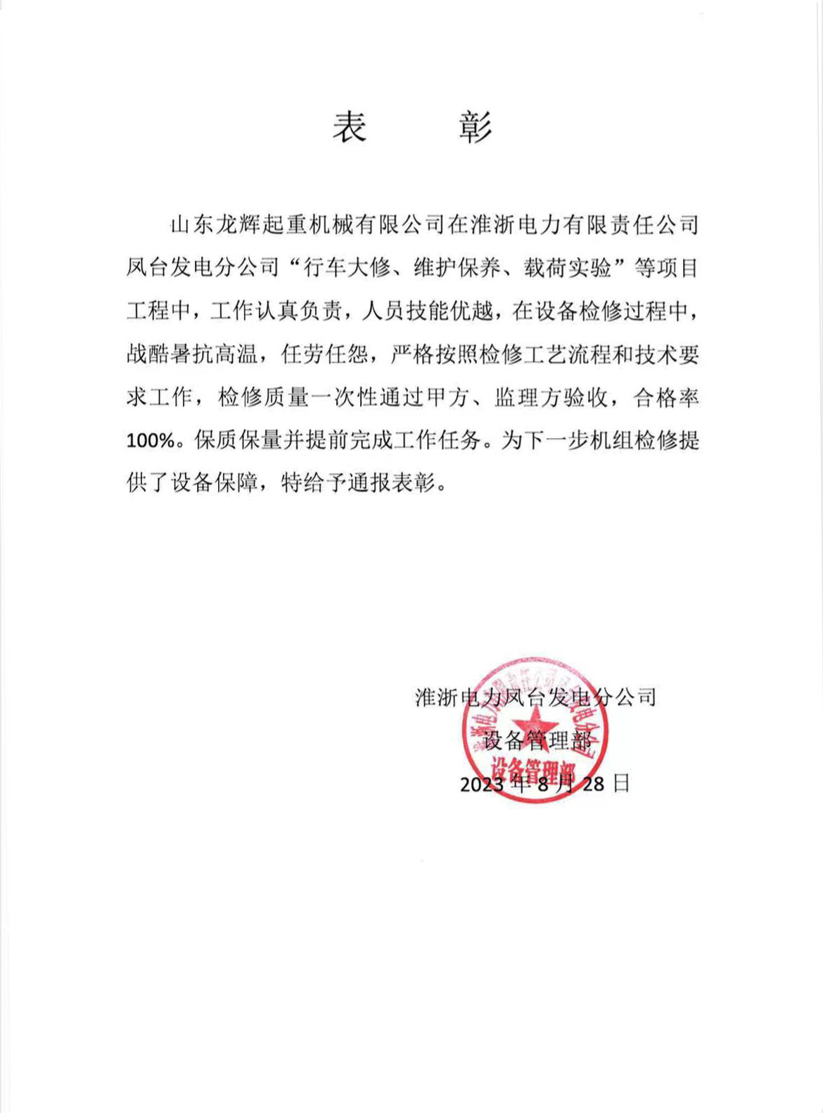 近日,我公司收到濰浙電力有限責(zé)任公司鳳臺(tái)發(fā)電分公司發(fā)來(lái)的表?yè)P(yáng)信,對(duì)龍輝起重服務(wù)人員的敬業(yè)態(tài)度和優(yōu)質(zhì)服務(wù)給予了充分肯定和高度評(píng)價(jià)。