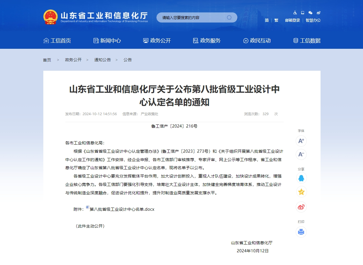 近日,山東省工業(yè)和信息化廳公布了第八批省級(jí)工業(yè)設(shè)計(jì)中心認(rèn)定名單的通知。